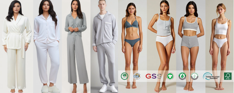 先端技術と品質基準を両立。ライクラ対応プリント、ジェルドット、シームレス加工を組み合わせ、高い快適性・意匠性・機能性を備えた中高級インナーを量産します。吸湿速乾や再生素材など機能性ファブリックを用途別に最適提案。全原材料はOEKO-TEX認証取得済みで、SGS/Intertekの第三者試験をクリア。環境面では生分解性素材や環境配慮資材を採用し、GRS認証も取得。短納期・小ロットにも柔軟に対応し、日本向けOEM/ODMの品質要件に適合します。主要取引先はWacoal、Gamtan、Jockey、NEXT、DORINA、Targetなどです。